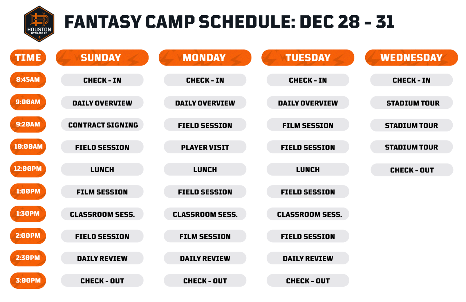 Players in the Houston Dynamo Fantasy Camp will tour exclusive areas in the team's training facility and at Shell Energy Stadium. Youth players will also have the opportunity to meet with First Team players and Technical Staff. Registration for the Houston Dynamo Fantasy Camp includes a Houston Dynamo Youth Programs training shirt, a branded soccer ball, and a discounted ticket to a Houston Dynamo game.