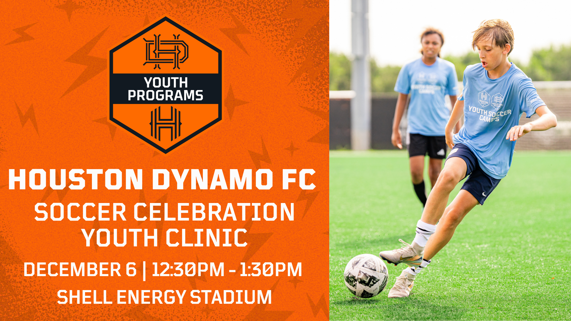 Join our Youth Programs for a free youth soccer clinic from 12:30pm - 1:30pm on the Shell Energy Stadium field! Boys and girls aged 6-14 years old will learn from our Houston Dash and Dynamo Youth Programs coaches. The free clinic will feature coaching on individual ball mastery and include fun, small-sided games for the youth in attendance.
